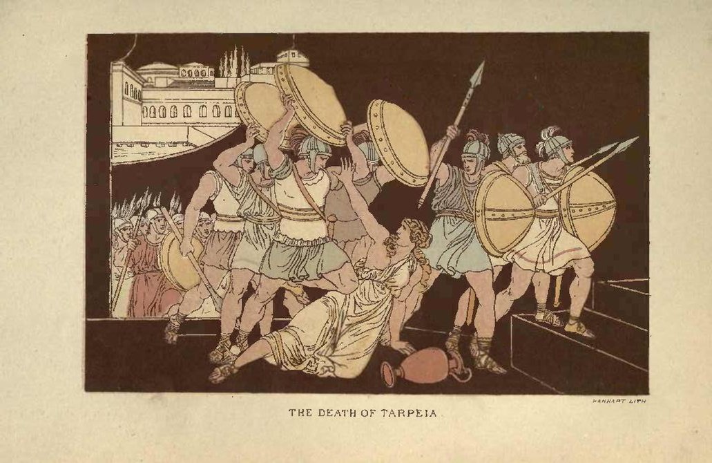 Under cover of darkness, Tarpeia admits the Sabines. She expects bracelets, perhaps the round fibulae that fasten cloaks. Instead, she receives the literal fulfillment of her request. The Sabines crush her with their shields, which are also borne on the left arm. The weight of bronze and scorn buries her on the slope of the Capitoline.