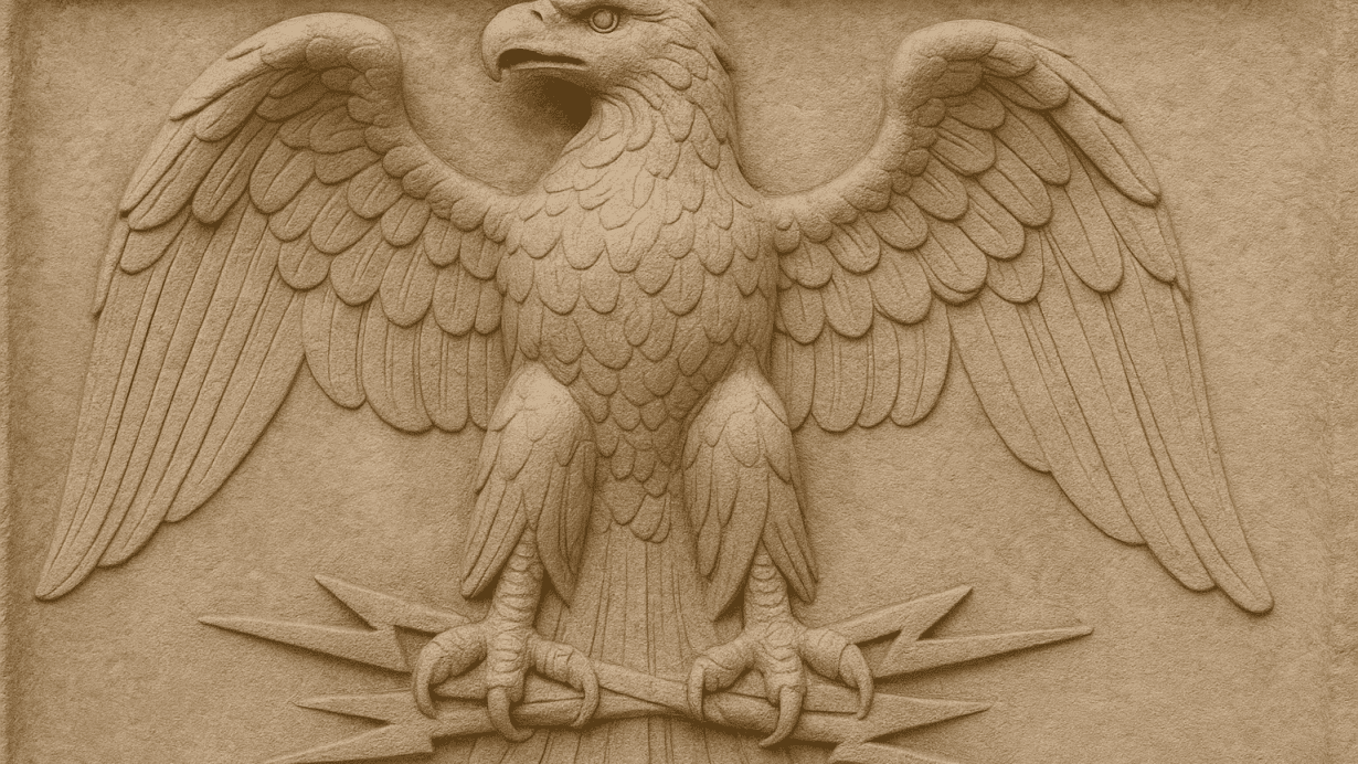 A Roman eagle carved in stone relief, wings spread wide and clutching a thunderbolt, symbolizing Jupiter’s divine power and authority.